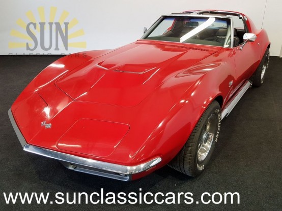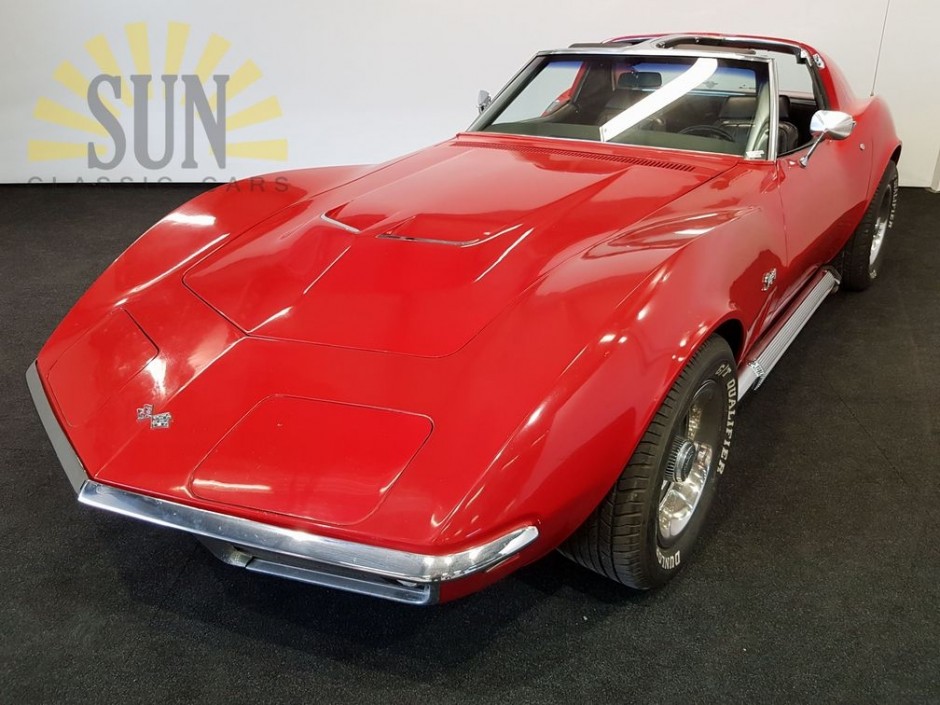 Chevrolet Corvette C3 Stingray de 1969. Livraison d’origine de cette Corvette etait avec les feux arrieres rondes populaires et pare-chocs chromes. Voiture roule, frein, change vitesses et est en bon etat. Cette Chevrolet aussi a side-pipes d’origines avec covers avec nouveau chrome, moteur 350 CUI V8 et boite manuelle. La Corvette a carte grise americaine et les documents d’importation.